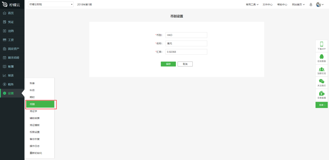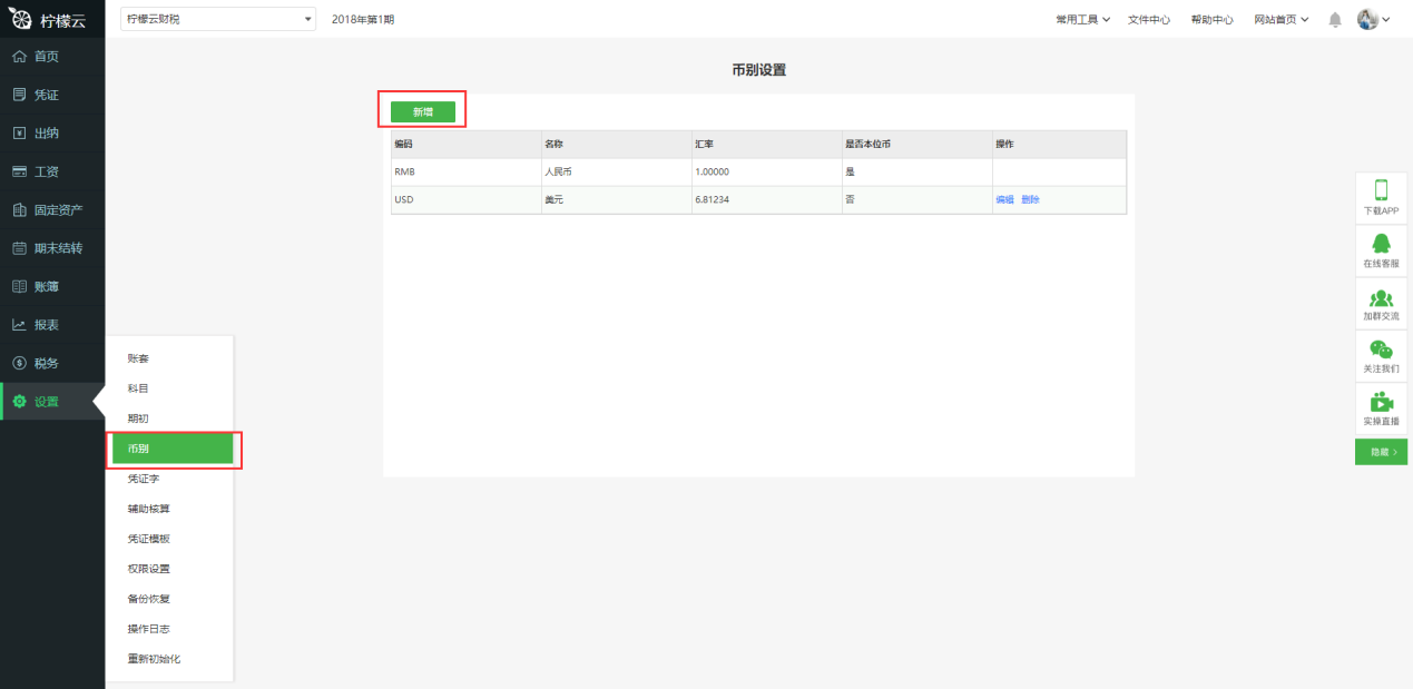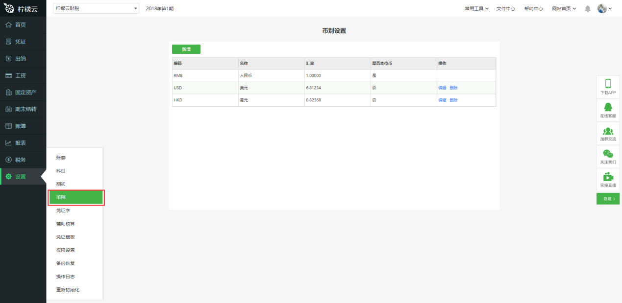 b)如果没有,需要先维护币别:点击主菜单的“设置”中“币别”,录入相应的币别数据。