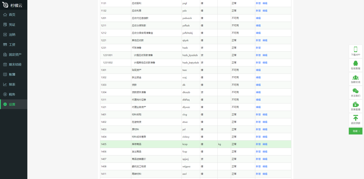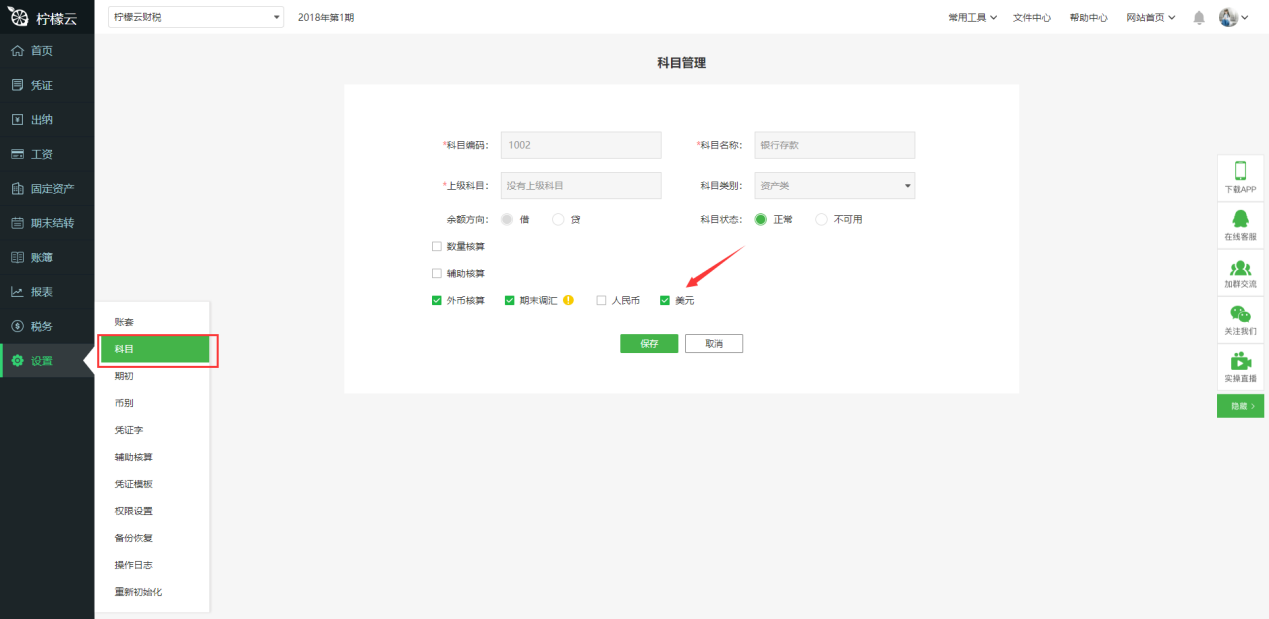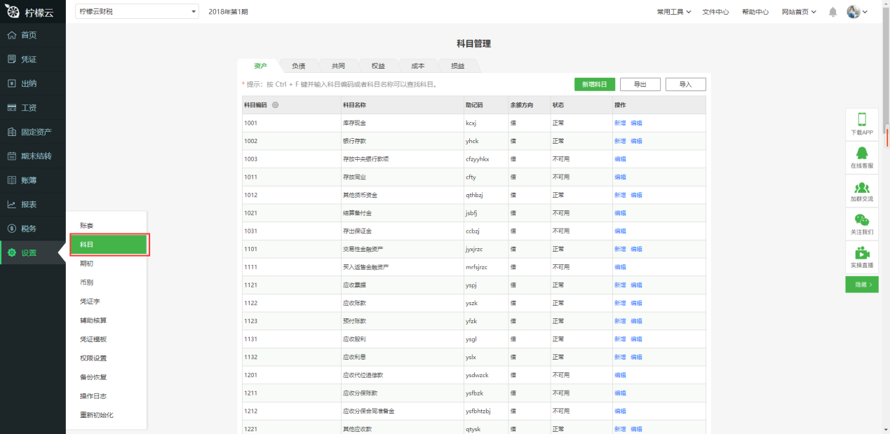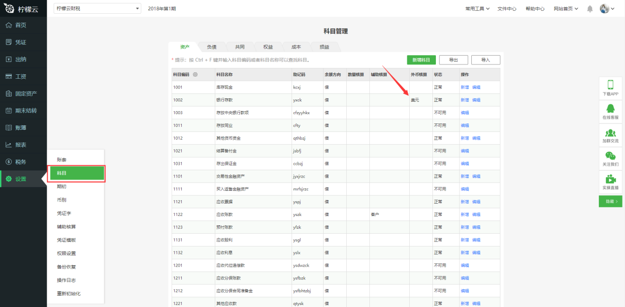 ②编辑科目:点击科目后面的“编辑” ,可以编辑科目,设置数量核算、辅助核算、外币核算。