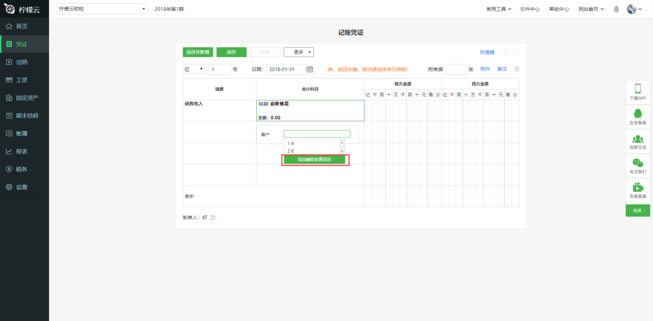 c)录入凭证时,选择已设置辅助核算的科目,点击“添加辅助核算项目”,设置对应的辅助核算。
