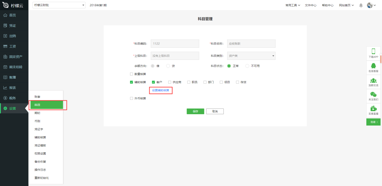 a)首次在科目设置辅助核算时,可以直接点击“设置辅助核算”,设置对应的辅助核算;